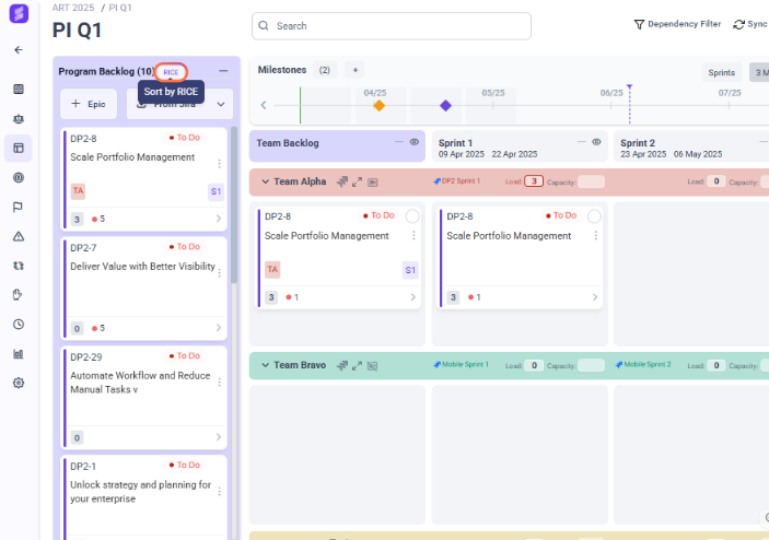 In the Program Board, sort your backlog by RICE score: