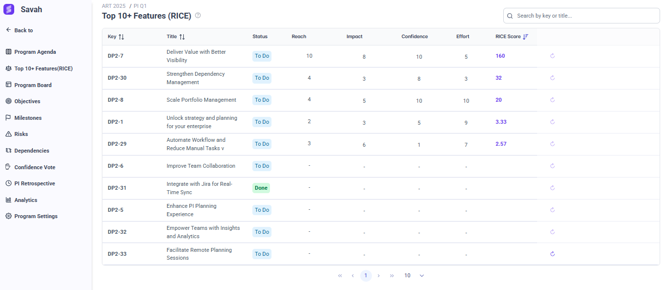 The RICE scoring model helps you make informed prioritization decisions by quantifying the value and effort of each feature. Just like WSJF, RICE enables structured, data-driven discussions during PI Planning.