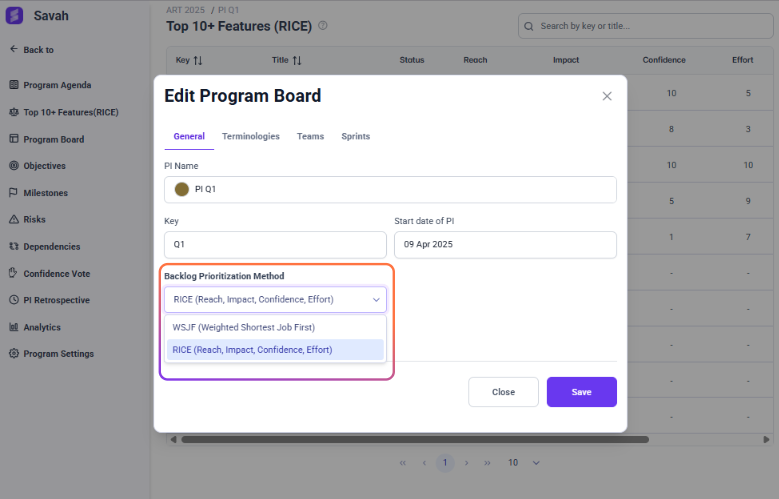 Savah allows you to toggle between **WSJF** and **RICE** prioritization methods based on your team's preferred framework.